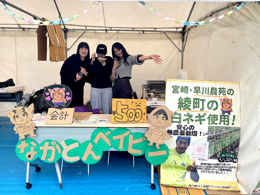学園祭の模擬店で、学生たちは「綾町のネギ使用」という大きな看板を掲げました。自分たちが草抜きをしたあの畝のネギを仕入れ、「とんぺい焼き」として提供したのです。模擬店での利益のみを追求するのではなく、綾町の有機農業や生産者への支援、栄養の偏りの改善を視野に入れたこの取り組みは、SDGsの「飢餓をゼロに(目標2)」につながる有意義な実践の機会となりました。